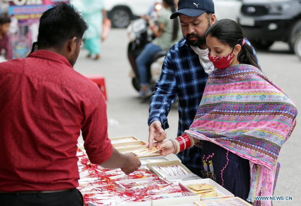 A woman shops for rakhis, or sacred threads, in a market ahead of Raksha Bandhan festival in Amritsar district of India's northern state Punjab, Aug. 21, 2021. Raksha Bandhan is celebrated every year by the tying of a thread on the wrist of a brother by his sister as a mark of bond and ritual protection. (Str/Xinhua)
