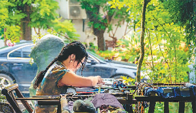 Chen Yinghua makes her embroidery works. (Photo/Zhong Chenglei)