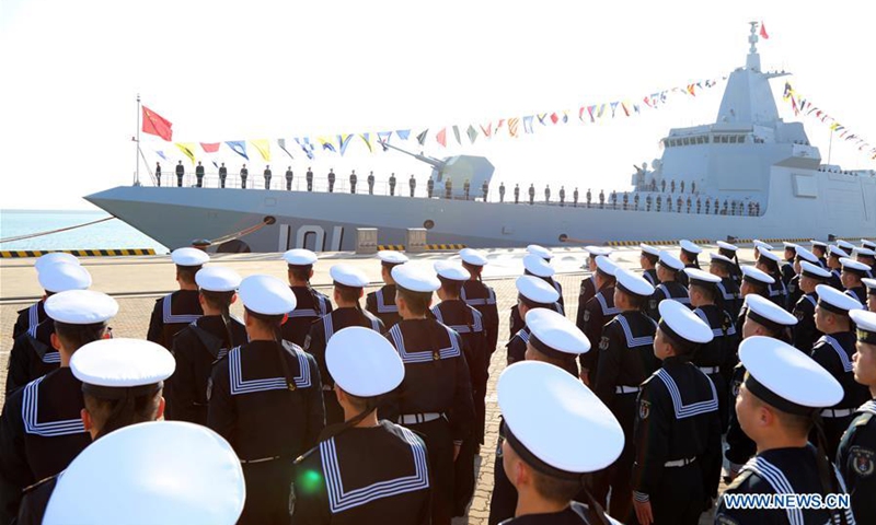 Photo taken on Jan. 12, 2020 shows the ceremony of the commissioning of the Nanchang, China's first Type 055 guided-missile destroyer, in the port city of Qingdao, east China's Shandong Province. The commission of Nanchang marks the Navy's leap from the third generation to the fourth generation of destroyers, according to a statement from the Navy. (Photo by Li Tang/Xinhua)