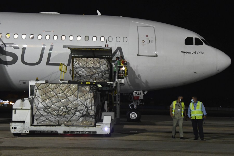Staff members unload China-donated medical supplies at Havana's Jose Marti International Airport in Havana, Cuba, Aug. 28, 2021. (Photo by Joaquin Hernandez/Xinhua)