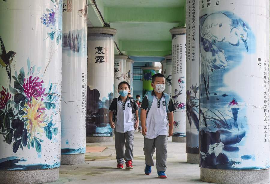 Students walk on the campus at Shuiguohu No.1 elementary school in Wuhan, central China's Hubei Province, Sept. 1, 2021. (Photo by Deng Nan/Xinhua)