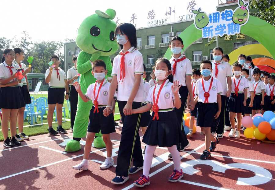 Pupils walk to attend the opening ceremony for the new semester at the Taipinglu Primary School in Beijing, capital of China, Sept. 1, 2021. (Xinhua/Ren Chao)
