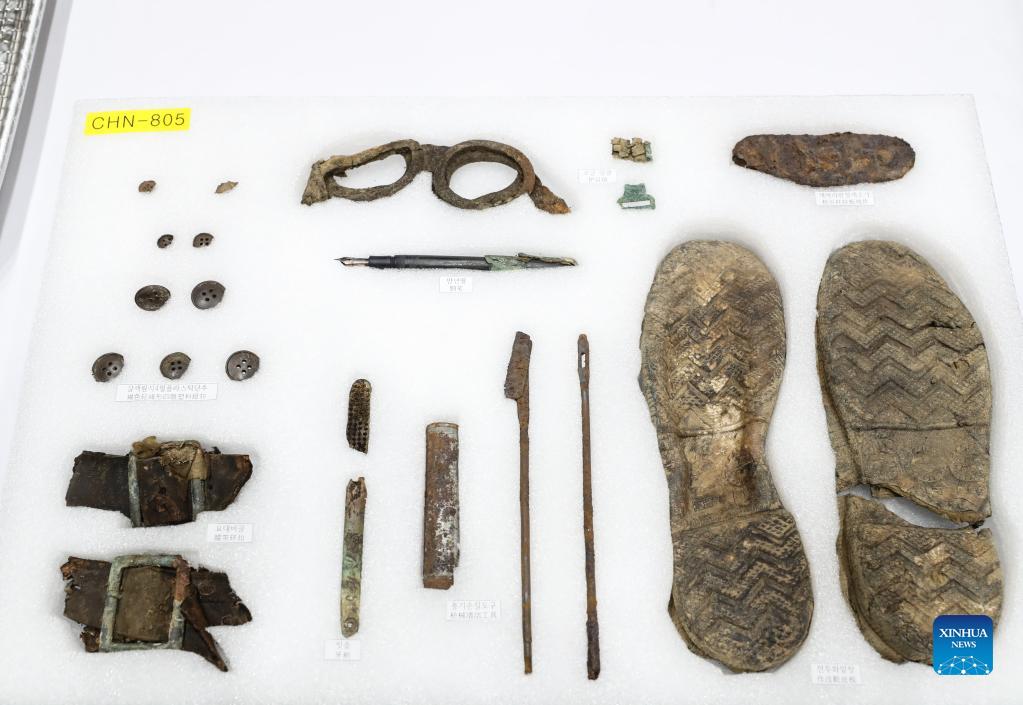 Photo taken on Sept. 1, 2021 shows related relics of Chinese soldiers killed in the 1950-53 Korean War, in Incheon, South Korea. The remains of 109 Chinese soldiers killed in the 1950-53 Korean War were casketed in South Korea on Wednesday to be sent back to China. The ceremony to lay the 109 remains in coffins was held in Incheon, west of the capital Seoul. (Xinhua/Wang Jingqiang)