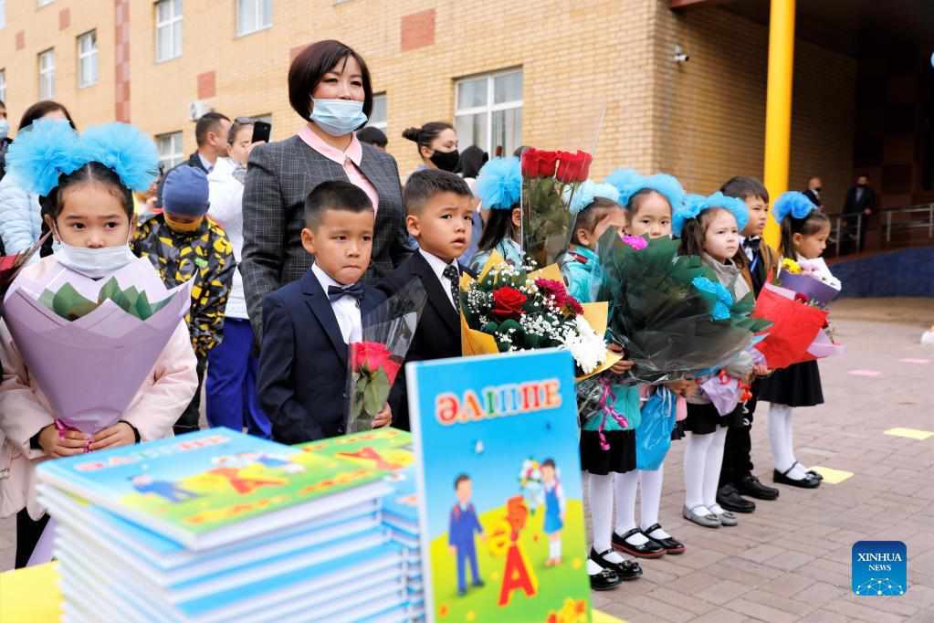 Students of an elementary school usher in a new semester in Nur-Sultan, Kazakhstan, Sept. 1, 2021. (Photo by Kalizhan Ospanov/Xinhua)