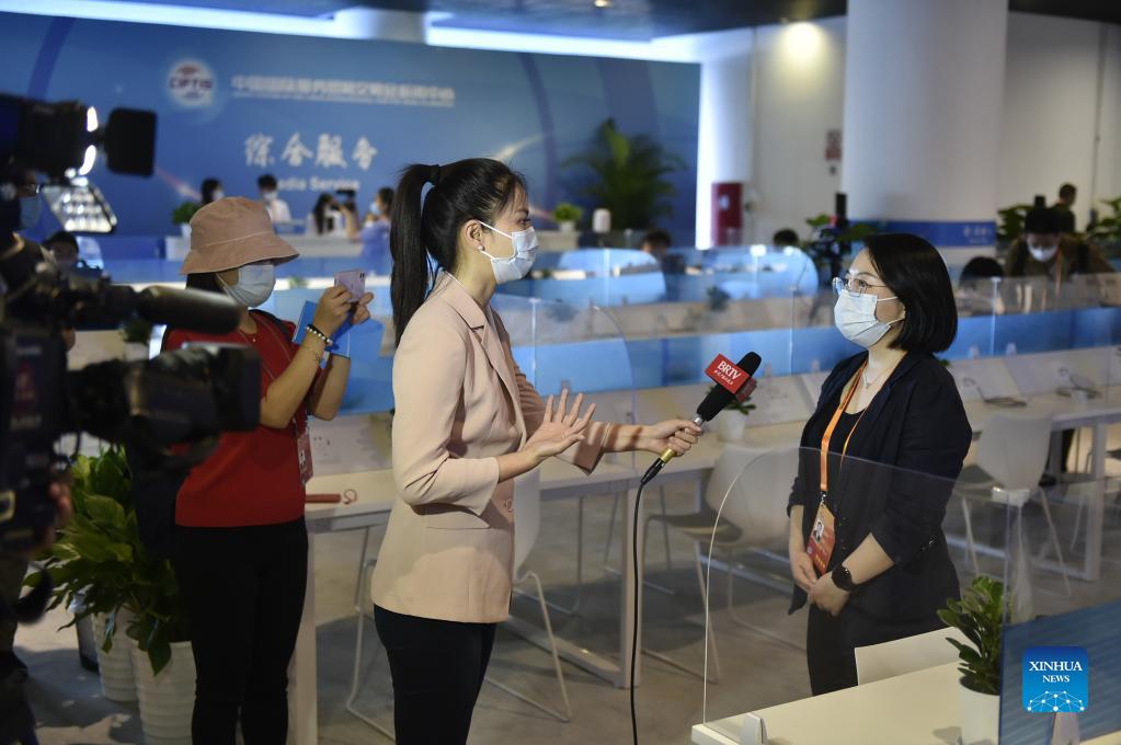 Journalists work at the media center of the China International Fair for Trade in Services (CIFTIS) at the China National Convention Center in Beijing, capital of China, Sept. 1, 2021. The media center of the CIFTIS started trial operation on Wednesday. The CIFTIS is to be held from Sept. 2 to 7 this year. (Xinhua/Lu Peng)