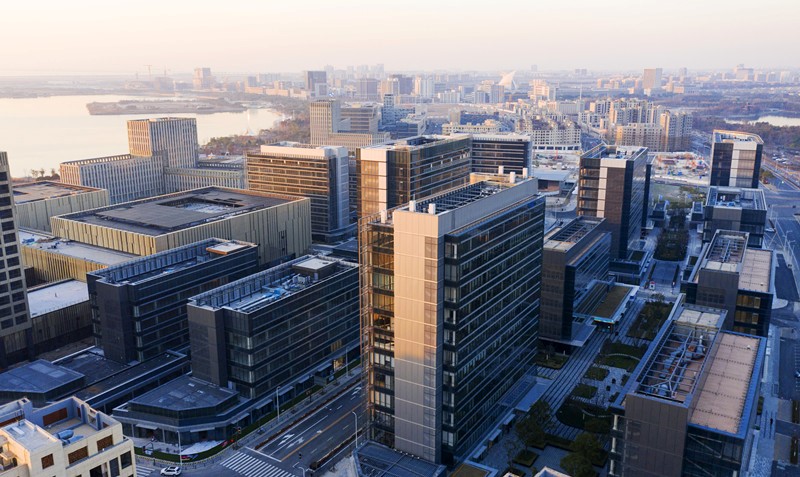Photo taken on Jan. 2, 2021 shows buildings beside the Dishui Lake in the Lin-gang Special Area of China (Shanghai) Pilot Free Trade Zone. (Photo by Ji Haixin/People's Daily Online)