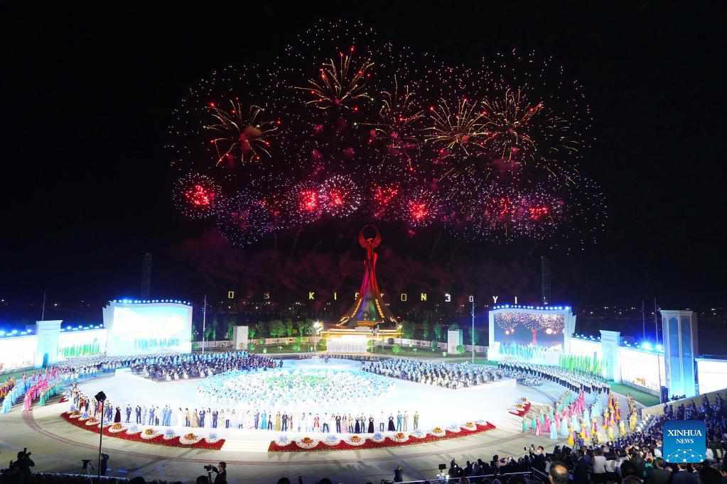 Fireworks are seen during a celebration of the country's 30th anniversary of independence, in Tashkent, Uzbekistan, on Sept. 1, 2021. Uzbekistan became independent in 1991, and Sept. 1 of each year is Independence Day. (Photo by Zafar Khalilov/Xinhua)