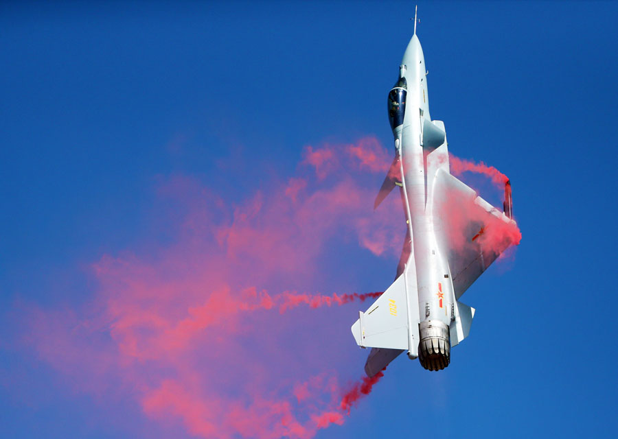 A People's Liberation Army Air Force J-10B fighter performs 'Pugachev's Cobra', a high-agility maneuver at the 12th China International Aviation and Aerospace Exhibition in Zhuhai, Guangdong province, in 2018. (Photo/China Daily)