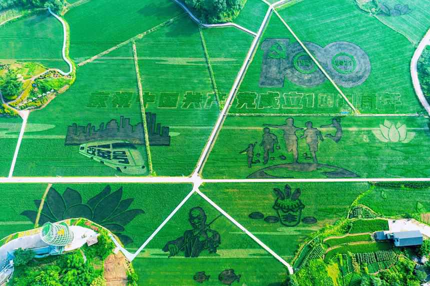 Multicolored paddy fields in Dazu district, southwest China's Chongqing Municipality, are covered with colorful late-season rice like a delicate carpet. In the Longping Polychrome Pastoral scenic area, the artistic landscape is comprised of rice featuring the theme of rural revitalization. The image of academician Yuan Longping, Dazu Rock Carvings (a traditional Buddhist rock cave located in Dazu district in southwest China's Chongqing Municipality) and other elements are spread out on the ground, outlining a beautiful picture of the countryside.
