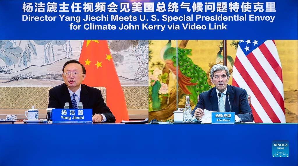 Yang Jiechi, a member of the Political Bureau of the Central Committee of the Communist Party of China (CPC), also director of the Office of the Foreign Affairs Commission of the CPC Central Committee, meets with U.S. Special Presidential Envoy for Climate John Kerry via video link upon invitation, Sept. 2, 2021. (Xinhua/Zhai Jianlan)