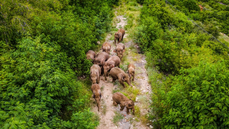Aerial photo taken on Aug. 9, 2021 shows a herd of wild Asian elephants in Yuanjiang County of Yuxi City, southwest China's Yunnan Province. (Xinhua/Hu Chao)