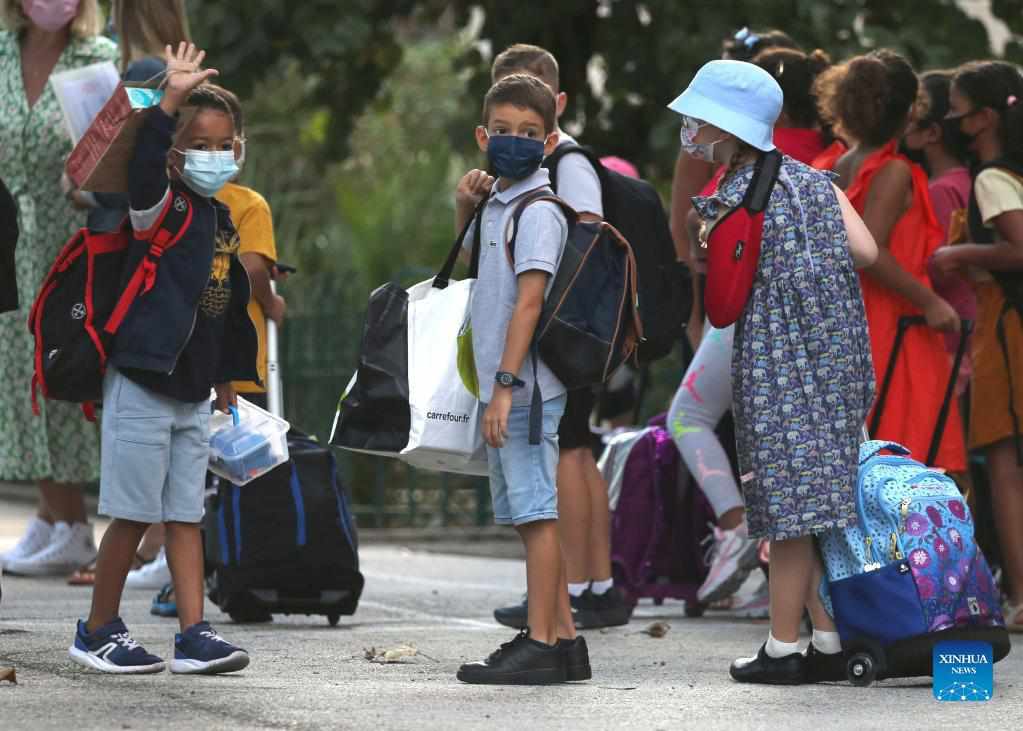 Students arrive at Fontonne school on the first day of the new school year in Antibes, southern France, on Sept. 2, 2021. (Photo by Serge Haouzi/Xinhua)