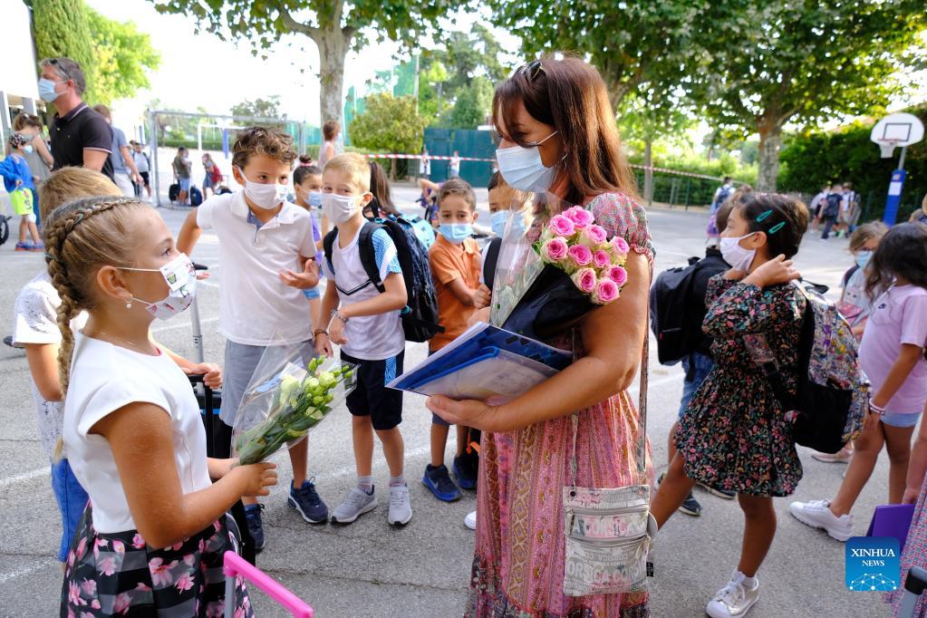 Students present flowers to their teacher on the first day of the new school year at Fontonne school in Antibes, southern France, on Sept. 2, 2021. (Photo by Serge Haouzi/Xinhua)