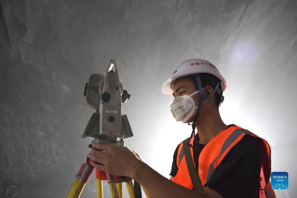 A worker prepares the drill-through of a railway tunnel in Du'an Yao Autonomous County, south China's Guangxi Zhuang Autonomous Region. Sept. 1, 2021. A 15.2-km tunnel on the high-speed railway linking Nanning of south China's Guangxi Zhuang Autonomous Region and Guiyang of southwest China's Guizhou Province was drilled through on Thursday. (Xinhua/Zhou Hua)