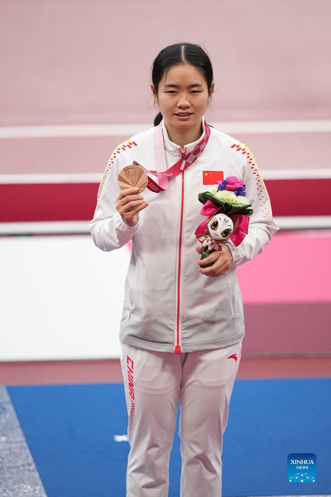 Jiang Fenfen of China poses for photos during the medal ceremony of the women's T37 class 100m final of athletics event at the Tokyo 2020 Paralympic Games in Tokyo, Japan, Sept. 2, 2021. (Xinhua/Xiong Qi)