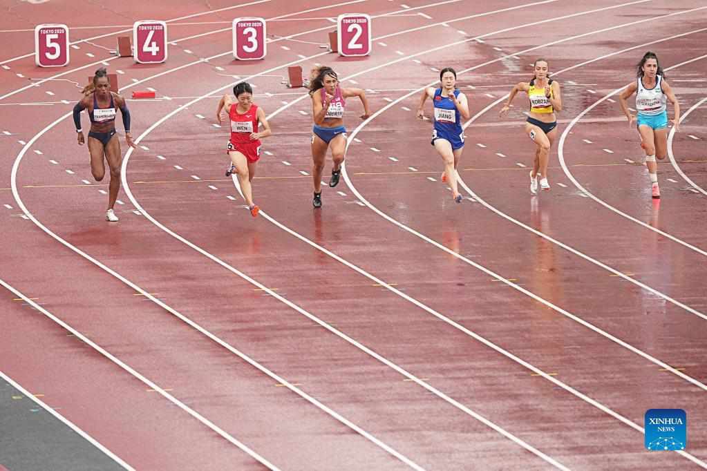 Athletes compete during the women's T37 class 100m final of athletics event at the Tokyo 2020 Paralympic Games in Tokyo, Japan, Sept. 2, 2021. (Xinhua/Xiong Qi)