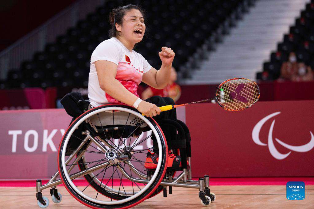 China's Zhang Jing celebrates during the women's singles WH1 match of badminton event against Cynthia Mathez of Switzerland at the Tokyo 2020 Paralympic Games in Tokyo, Japan, Sept. 2, 2021. (Xinhua/Cheong Kam Ka)