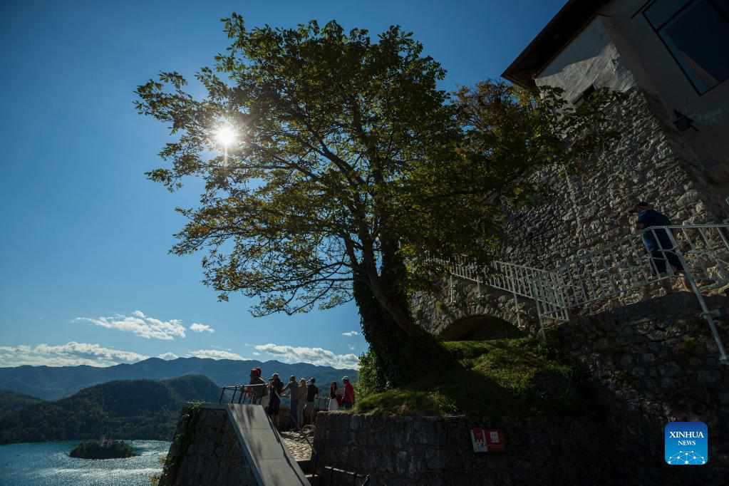 Visitors overlook Bled lake from Bled castle in Slovenia, Sept. 1, 2021. Bled lake is one of the most attractive tourist destinations in Slovenia. (Photo by Zeljko Stevanic/Xinhua)