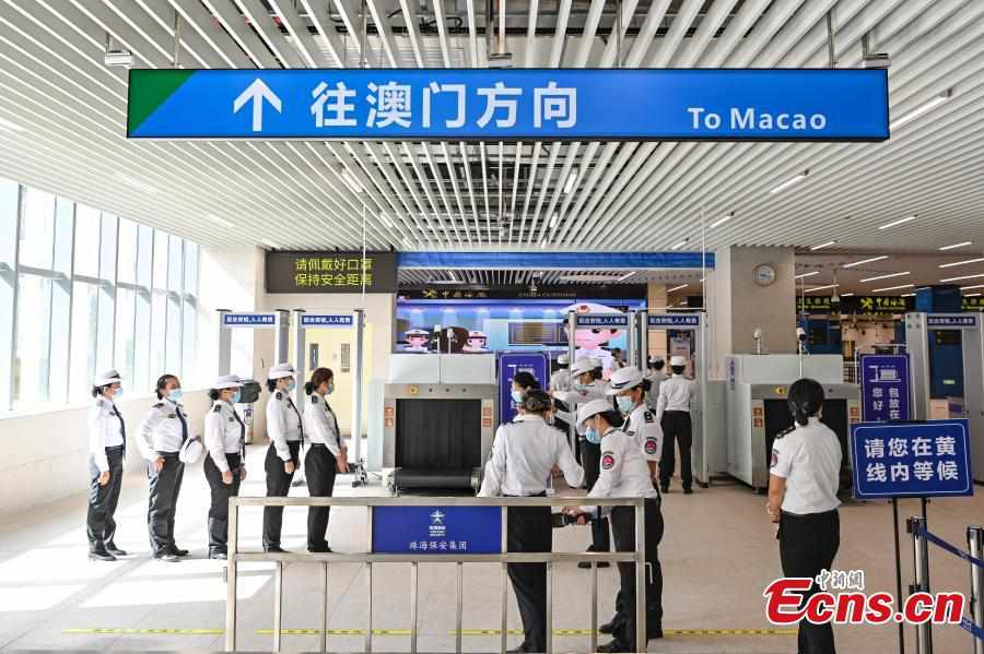 Photo taken on Sept. 2, 2021 shows security personnel conduct a security check drill at the Qingmao Checkpoint in Zhuhai, South China's Guangdong Province. (Photo: China News Service/Chen Jimin)