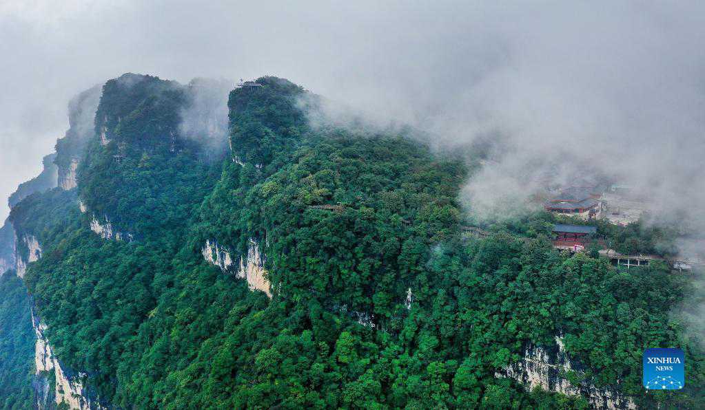 Aerial photo taken on Sept. 2, 2021 shows the scenery of Longtoushan scenic area shrouded in clouds in Nanzheng District of Hanzhong, northwest China's Shaanxi Province. (Xinhua/Tao Ming)