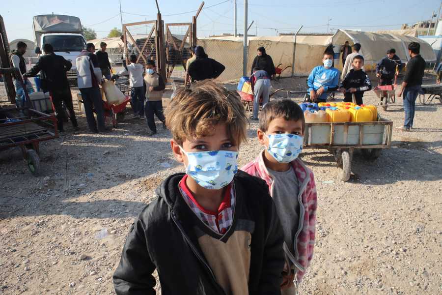 Children wearing masks are seen outside fuel distribution site in Hasansham U3 Camp in Nineveh province, Iraq, Dec. 8, 2020. (Xinhua)