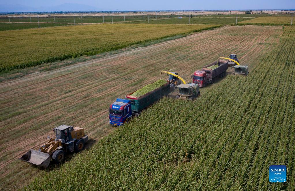 Aerial photo taken on Sept. 2, 2021 shows farmers operating harvesters to reap corn crops in the field of Pingluo County, northwest China's Ningxia Hui Autonomous Region. (Xinhua/Yang Zhisen)