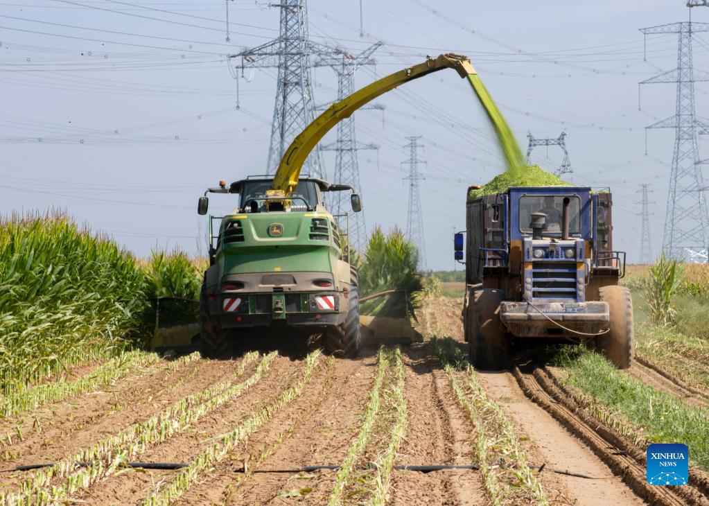 Photo taken on Sept. 2, 2021 shows farmers operating harvesters to reap corn crops in the field of Pingluo County, northwest China's Ningxia Hui Autonomous Region. (Xinhua/Yang Zhisen)