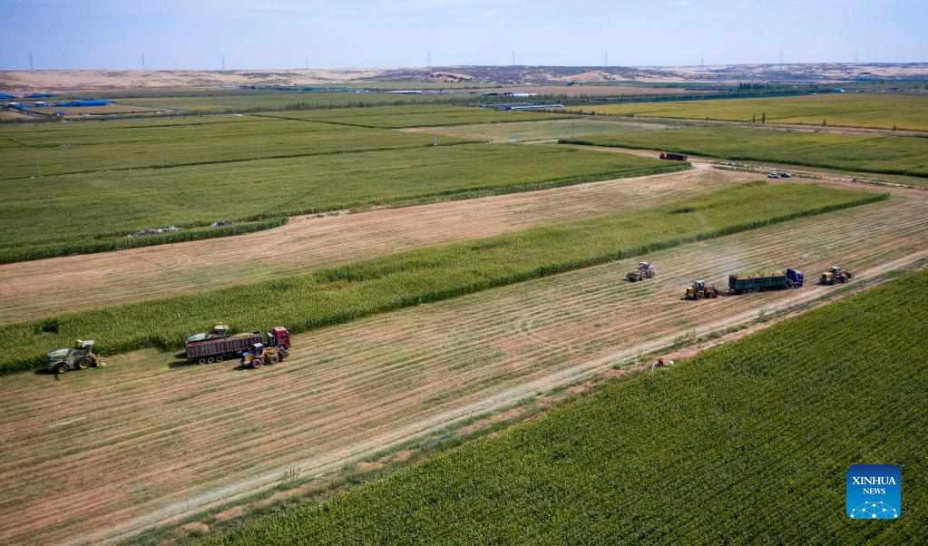 Aerial photo taken on Sept. 2, 2021 shows farmers operating harvesters to reap corn crops in the field of Pingluo County, northwest China's Ningxia Hui Autonomous Region. (Xinhua/Yang Zhisen)