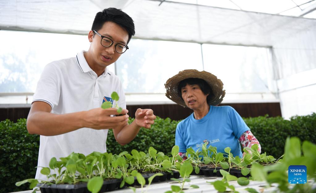 Fung Leung (L) communicates with a staff member on the growth of vegetables at his aquaponics production base in the national agricultural demonstration zone in Kaiping City, Jiangmen, south China's Guangdong Province, on Sept. 2, 2021. Victor Lo, Fung Leung and Mandy Tam, all born in the 1990s in Hong Kong, south China, came to the Kaiping national agricultural demonstration zone for their aquaponics research. Aquaponics is a forefront agricultural technology that combines fish-farming and vegetable-gardening, noted for its organic and eco-friendly production cycles, high output, and low energy consumption. With five years of research, the team managed to crack quite a few bottlenecks in the field and applied for nearly 10 patents. Thanks to support from the demonstration zone, they started an aquaponics production base and incorporated their own business. To date, the base annually yields some 300 tonnes of organic vegetables, most of them sold to Hong Kong. The trio said they owe their success to the development of the Guangdong-Hong Kong-Macao Greater Bay Area, and have full confidence in its future. (Xinhua/Deng Hua)