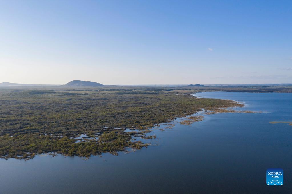 Photo taken on Aug. 31, 2021 shows a barrier lake and a volcano in the Wudalianchi Geopark in Heihe, northeast China's Heilongjiang Province. The Wudalianchi Geopark is famed for its volcanoes and hot springs. It has 14 volcanoes and five major volcanic barrier lakes. (Xinhua/Xie Jianfei)