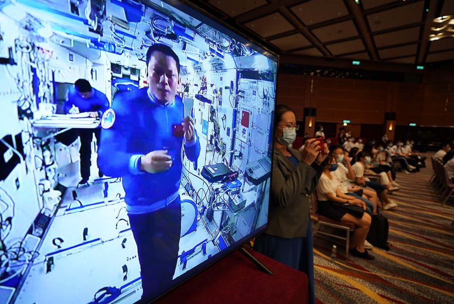 The astronauts in the Tiangong space station answered questions from the youngsters and showed them how to conduct experiments, do exercise and drink water in a weightless environment in the real-time video chat.