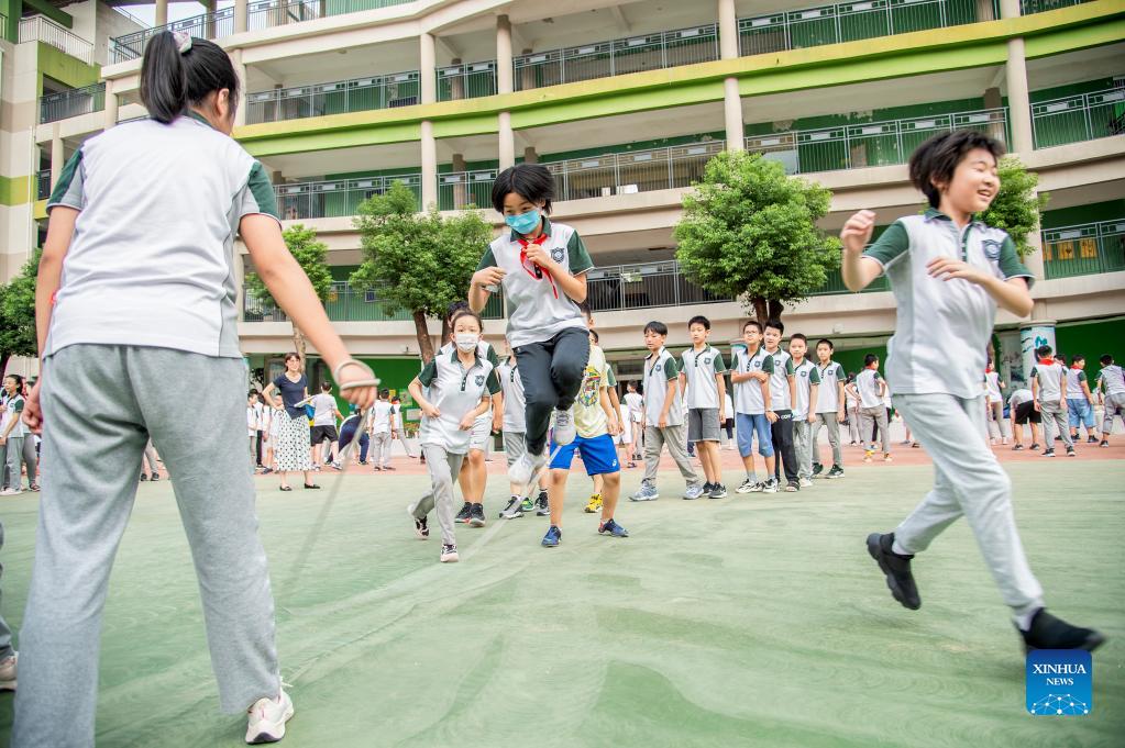 Students jump rope at a primary school in Wuhan, central China's Hubei Province, Sept. 1, 2021. Many elementary and middle schools in Wuhan began to provide different kinds of after-class services in order to meet students' individualized demands in the new semester. (Photo by Wu Zhizun/Xinhua)