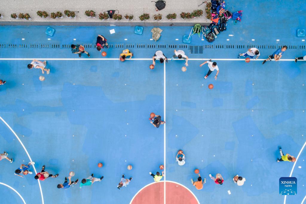 Aerial photo shows students playing basketball at a primary school in Wuhan, central China's Hubei Province, Sept. 2, 2021. Many elementary and middle schools in Wuhan began to provide different kinds of after-class services in order to meet students' individualized demands in the new semester. (Photo by Wu Zhizun/Xinhua)