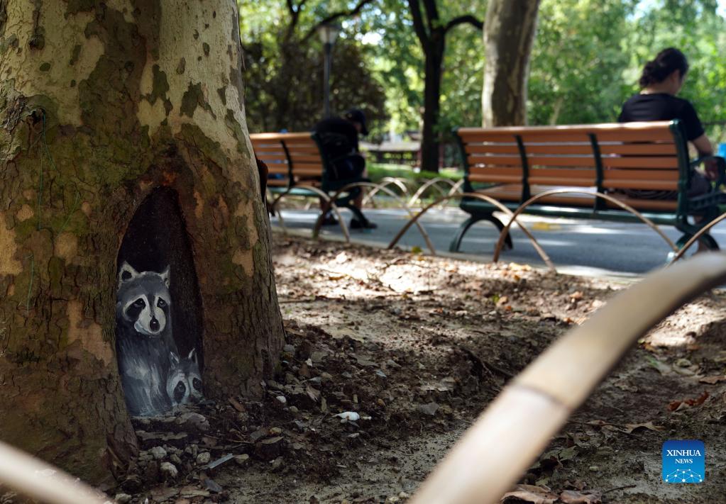 A painted tree hole is seen at Zhabei Park in Shanghai, east China, Aug. 31, 2021. Zhabei Park recently made an effort to improve its appearance by cleaning and beautifying tree holes in the park with creative patterns. (Xinhua/Liu Ying)