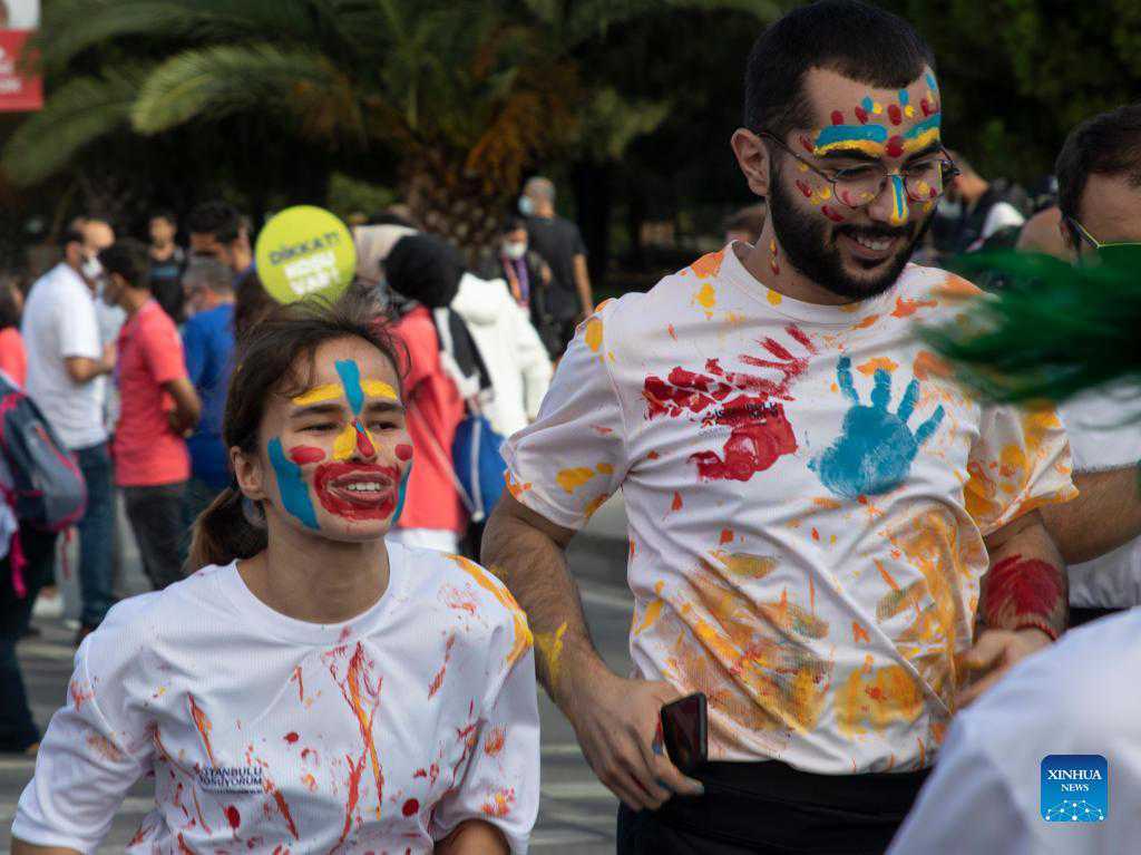 Runners take part in the Color Run in Istanbul, Turkey, on Sept. 5, 2021. Color Run, one of the most colorful sports events in Turkey's biggest city Istanbul, was held on Sunday with the participation of 1,250 runners. (Photo by Osman Orsal/Xinhua)