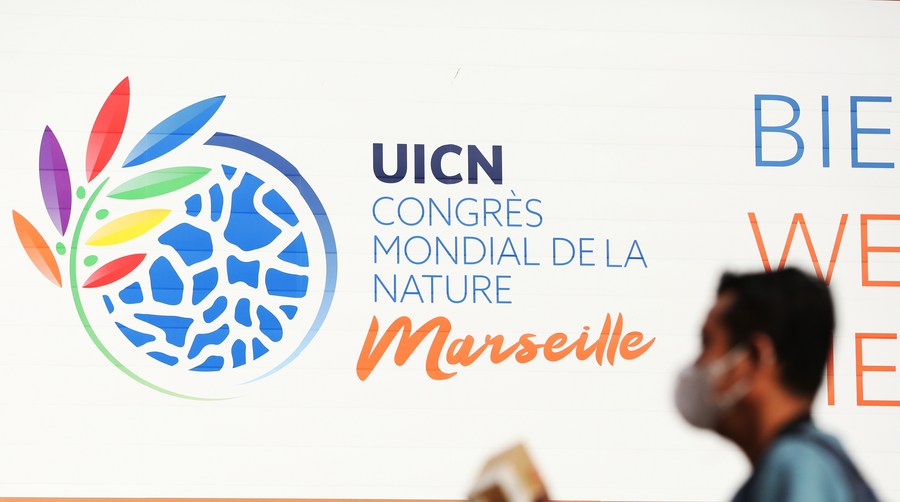 A man walks past a huge poster of the seventh World Conservation Congress (WCC) of the International Union for Conservation of Nature (IUCN) in Marseille, southern France, on Sept. 2, 2021. (Xinhua/Gao Jing)