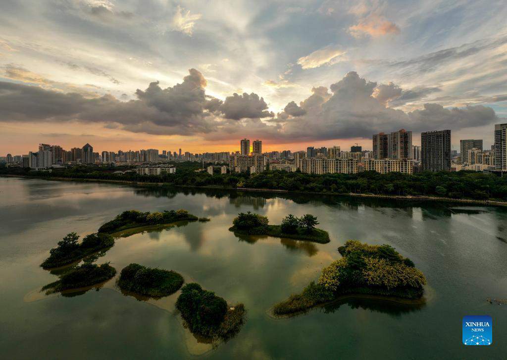 Aerial photo taken on Sept. 5, 2021 shows the view of sunset glow in Nanning, south China's Guangxi Zhuang Autonomous Region. (Xinhua/Cao Yiming)