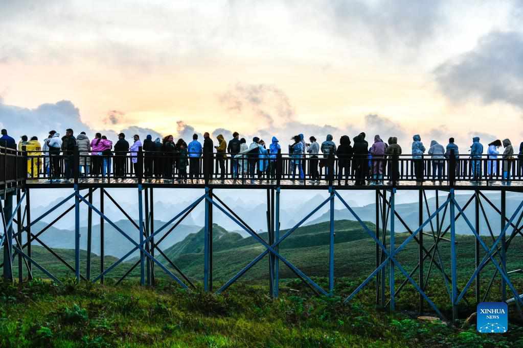 Tourists view the sunrise at a scenic spot in Hezhang County, southwest China's Guizhou Province, Sept. 4, 2021. Hezhang County, featuring beautiful natural scenery and distinctive culture, has ramped up efforts in improving tourism facilities and boosting tourism industry in recent years. Tourism development of the county has given impetus to its rural revitalization. Statistics show that the county has received 4.34 million visitor trips from January to August this year. (Xinhua/Yang Wenbin)