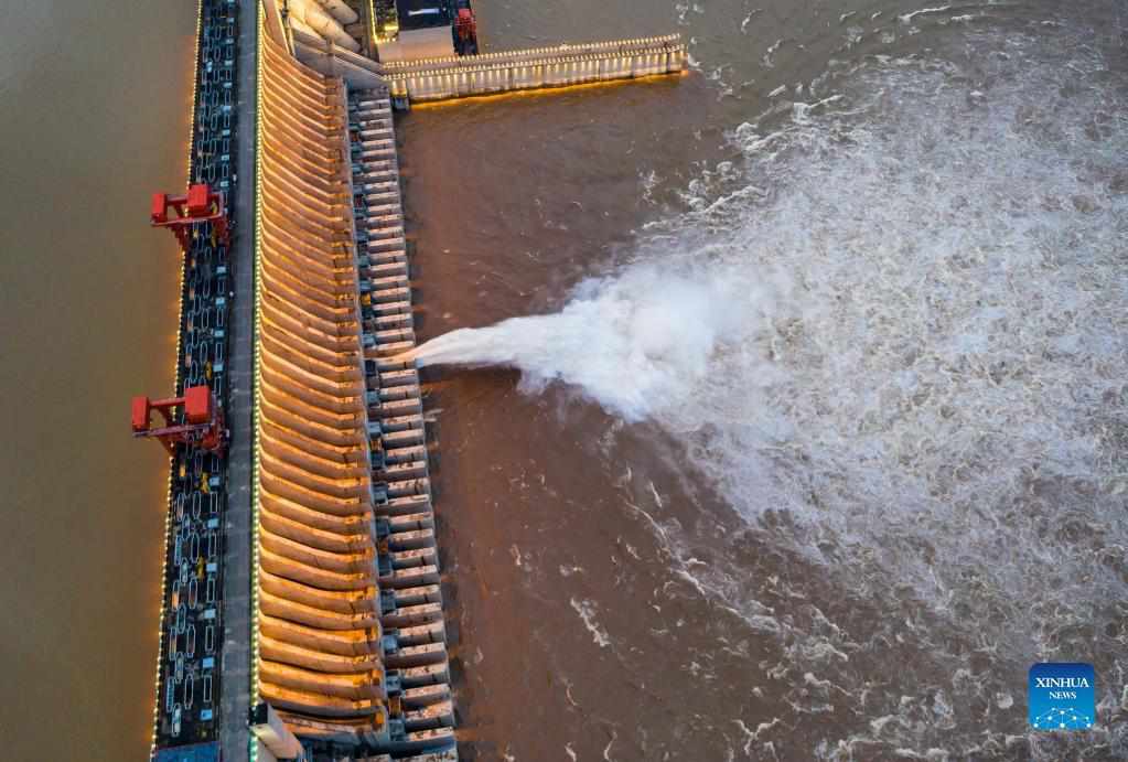 Aerial photo taken on Sept. 6, 2021 shows a view of the Three Gorges Dam in central China's Hubei Province. Chinese authorities have called for rigorous anti-flooding measures along the Yangtze River as water levels continue to rise following heavy rainfall, the Ministry of Water Resources said on Monday. The flow of water at the Three Gorges reservoir has increased rapidly, reaching 54,000 cubic meters per second as of 2 p.m. Monday. The ministry said it is maintaining its response at Level IV, and has called for more anti-flooding measures at the Three Gorges reservoir and other main projects along the river. China has a four-tier flood-control emergency-response system, with level I being the most severe. (Photo by Zheng Jiayu/Xinhua)