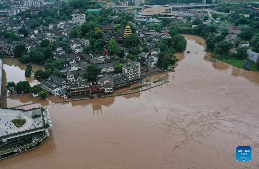 Aerial photo taken on Sept. 6, 2021 shows the flood-affected area in Ciqikou, southwest China's Chongqing Municipality. The emergency response for flood control was upgraded from level IV to III on Monday, according to Chongqing's flood control and drought relief headquarters, as Jialing River in Chongqing witnessed rapidly increasing water levels following constant heavy rainfall. (Xinhua/Wang Quanchao)