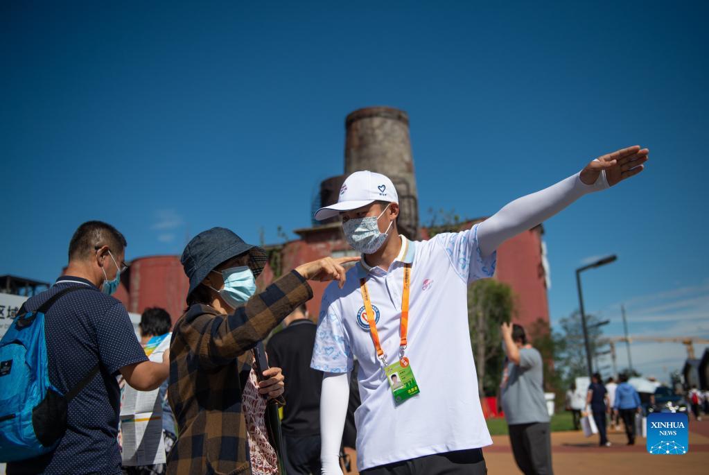 Han Qingdong, a volunteer of the China International Fair for Trade in Services (CIFTIS), shows a visitor the way at the Shougang Park during the CIFTIS in Beijing, capital of China, Sept. 6, 2021. (Xinhua/Chen Zhonghao)