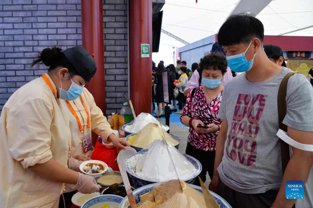 A visitor (R) purchases Chinese snacks in Shougang Park during the China International Fair for Trade in Services (CIFTIS) in Beijng, capital of China, Sept. 6, 2021. (Xinhua/Xu Qin)
