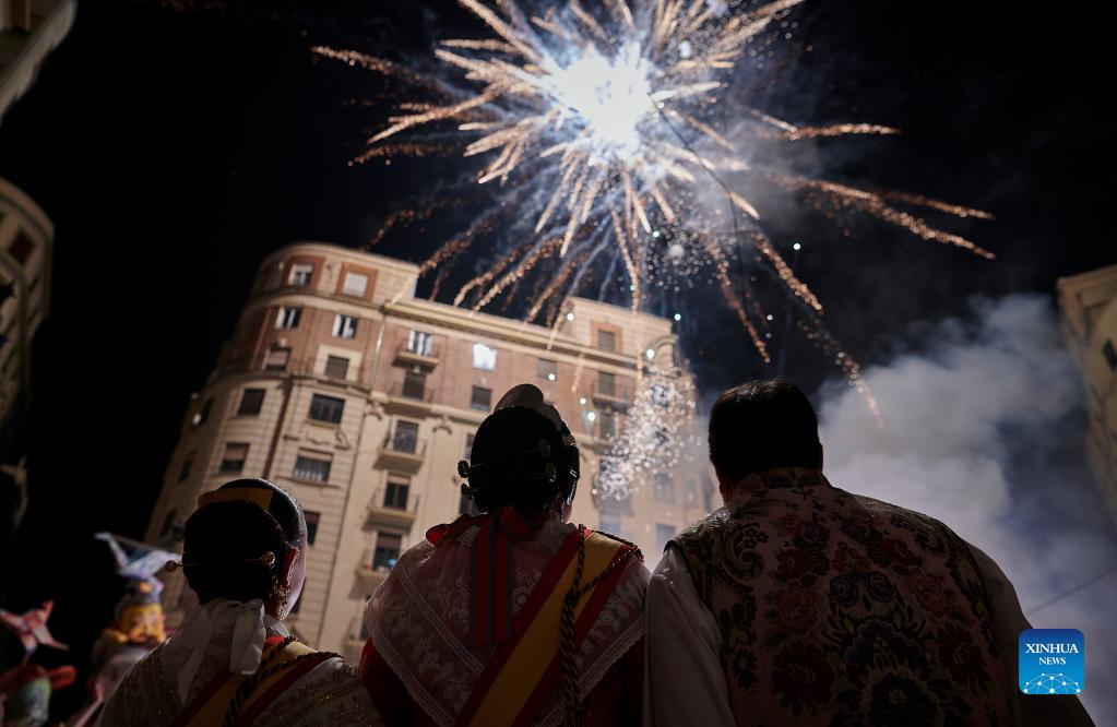People watch fireworks during the Fallas Festival celebrations in Valencia, Spain, on Sept. 6, 2021. The Fallas Festival is a traditional celebration in commemoration of Saint Joseph in the city of Valencia. The festival was postponed until this September due to the COVID-19 pandemic. (Photo by Pablo Morano/Xinhua)