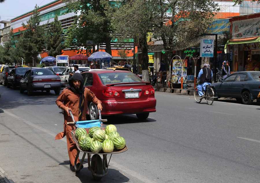 An Afghan man pushes a handcart on the street in Kabul, capital of Afghanistan, Aug. 31, 2021. (Photo by Kabir/Xinhua)