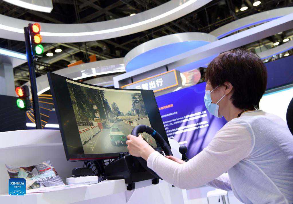 A visitor experiences intelligent driving during the 2021 China International Fair for Trade in Services (CIFTIS) in Beijing, capital of China, on Sept. 7, 2021. The six-day 2021 China International Fair for Trade in Services (CIFTIS) is coming to a close on Tuesday, with businesses wrapping up their exhibitions of products and services offline and online, and industry leaders finalizing their thematic conferences. (Xinhua/Wu Wei)