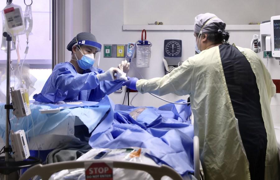Healthcare workers operate in an ICU in the "COVID Area" of the Beverly Hospital in Montebello City, California, the United States, Jan. 22, 2021. (Xinhua)