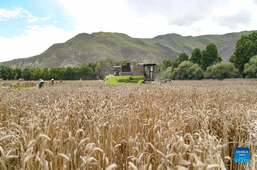 A farmer operates a harvester to reap highland barley at Kere Village of Dagze District, Lhasa, capital of southwest China's Tibet Autonomous Region, Sept. 6, 2021. (Xinhua/Jigme Dorje)