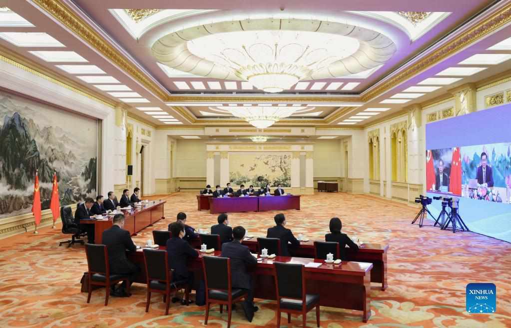 Zhao Leji, a member of the Standing Committee of the Political Bureau of the Communist Party of China (CPC) Central Committee and secretary of the CPC Central Commission for Discipline Inspection, meets with Tran Cam Tu, a member of the Politburo of the Communist Party of Vietnam (CPV) Central Committee, and head of the Committee's Inspection Commission, via video link in Beijing, capital of China, Sept. 7, 2021. (Xinhua/Ding Haitao)