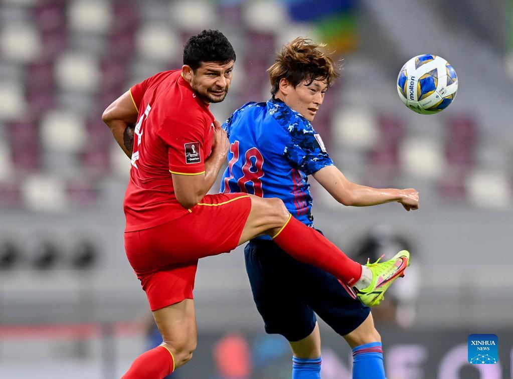 Ai Kesen (L) of China vies with Furuhashi Kyogo of Japan during the FIFA World Cup Qatar 2022 Asian qualification football match between China and Japan in Doha, Qatar, Sept. 7, 2021. (Photo by Nikku/Xinhua)