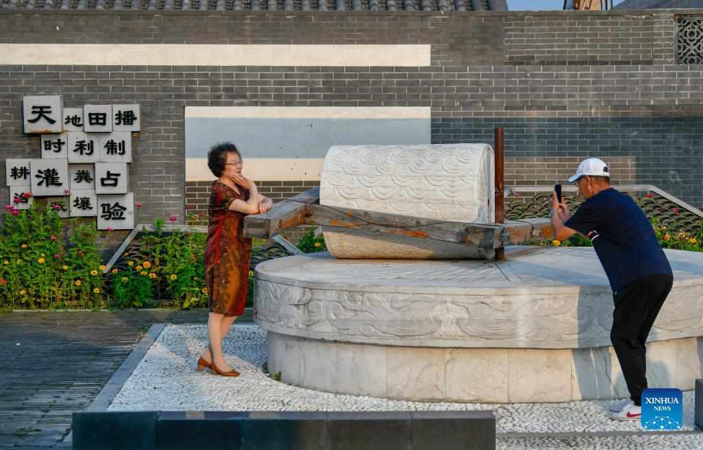 Tourists take photos at the local cultural park in Xiaoxinmatou Village of Baodi District in Tianjin, north China, Sept. 3, 2021. Li Chao is a post-90s born in Xiaoxinmatou Village in Baodi District. Located by the Chaobai River, the village used to witness an outflow of young people, as villagers made a living by traditional fishing and farming with low income. Like his young fellows, Li chose to be a migrant worker in the city for higher income. Waiter, chef, assembly line worker, security guard and salesman...the diligent man tried his hand at a variety of jobs over the past years, roving the city. In 2013, Li came back to his hometown to get married. A marvelous discovery for him, the small village has been transformed after renovation. Lucid waters, newly-built parks and neat farmyards...all the factors give the village characteristics and advantages to develop rural tourism industry. Witnessing the great changes, Li decided to stay and start an agritainment business in hometown. With the support of a host of favorable policies, the young man started a homestay business and soon expanded it due to excellent trading. "Better environment attracts a growing flow of tourists. During the peak season, rooms in my farmyard will be soon fully booked." Li said, who has been selected as a village commission member. "Now that I have been a member of the village commission, I'd like to do my best and help more fellow villagers to live a comfortable life." (Xinhua/Sun Fanyue)
